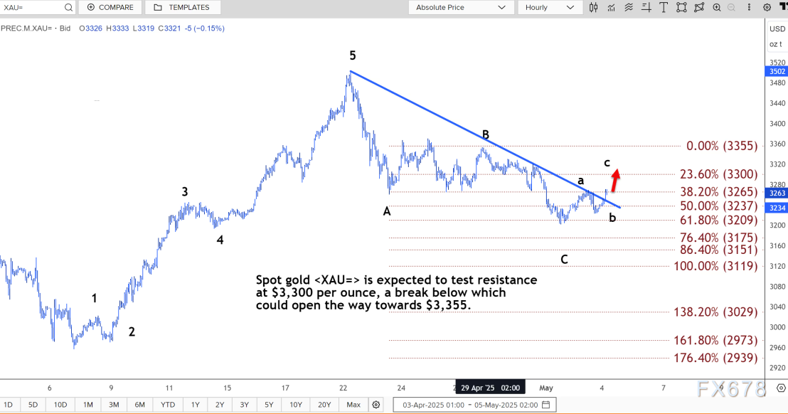 周一(5月5日)亚市早盘,现货黄金震荡上涨,一度触及3272.20美元/盎司附近,目前交投于3260关口附近。路透技术分析师指出,现货黄金预计将测试每盎司 3300 美元的阻力位,如果突破该水平可能打开通往 3355 美元的道路。