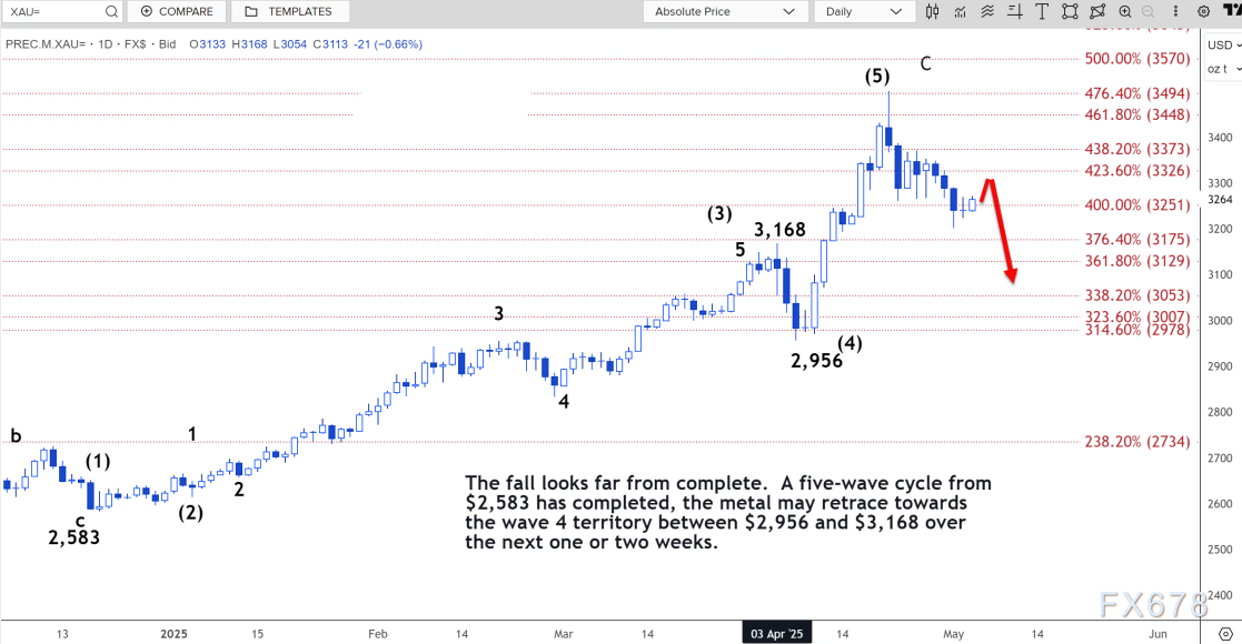 从 2583 美元开始的五浪周期已经完成,未来一两周内,金价可能回撤至 2956 美元至 3168 美元之间的第四浪区域。