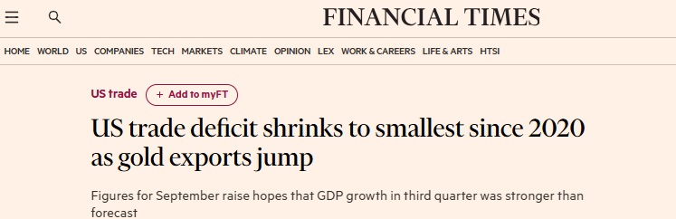 Pantheon Macroeconomics高级美国经济学家Oliver Allen称,他预计黄金金条出口的大幅跳升“几乎肯定会在第四季度回落”,因此9月贸易逆差的下降“说明不了太多问题”。
