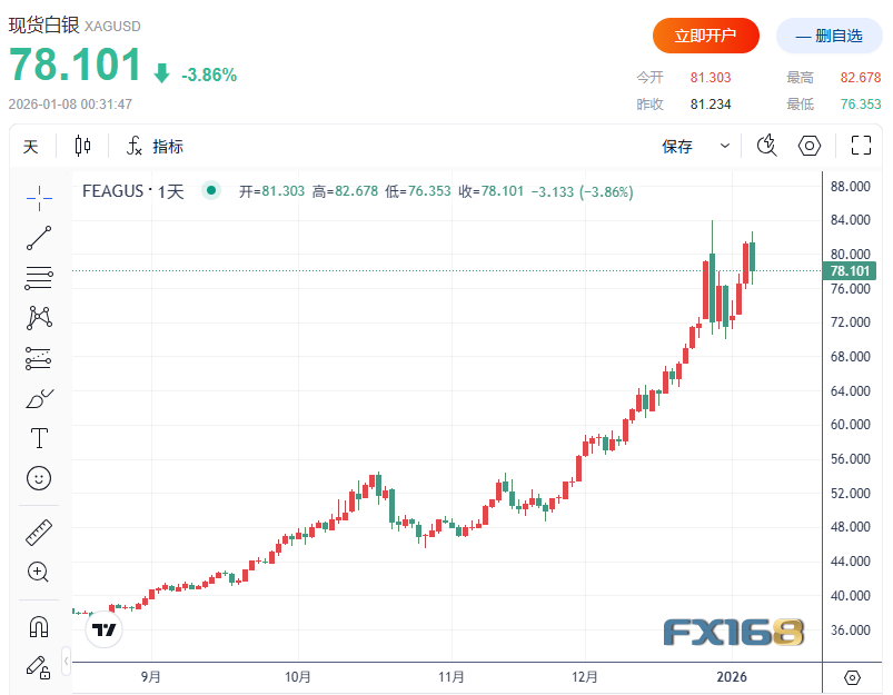 在黄金回落的同时,其他贵金属也出现明显调整。现货白银下跌约6%至76.353美元/盎司低点。汇丰上调2026年白银均价预期至68.25美元/盎司,理由是供应偏紧与投资需求强劲,但同时警告若供应约束缓解,银价波动可能加剧。现货铂金下跌超6.5%至2,244.62美元/盎司;钯金下跌超6%至1,700.63美元/盎司。