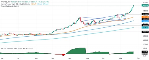 Valencia补充道,另一方面,假如金价跌破5050美元/盎司,这将为金价回调至5000美元/盎司及更低水平扫清道路,1月23日低点4899美元/盎司为下一个支撑位。