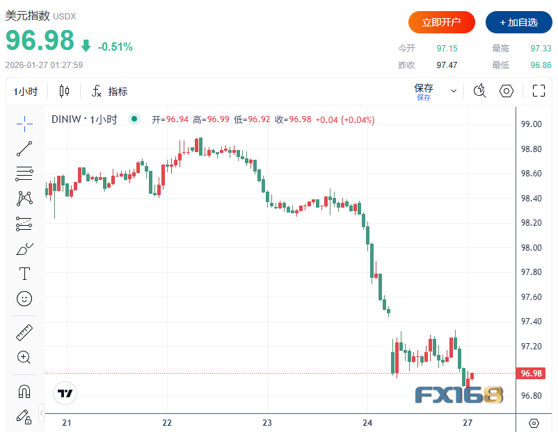 分析人士指出,美元走弱还受到美国政府可能停摆的担忧影响。美元指数下跌0.6%指96.86,延续此前跌势。此前由于格陵兰危机引发市场动荡,美元上周创下自5月以来表现最差的一周。