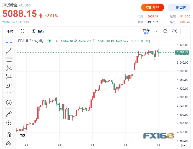 周一(1月26日),汇市与贵金属市场的“避险链条”被全面点燃:在市场押注美日可能协同行动支撑日元之际,美元跌至四个月低点,日元强势反转;美元走弱叠加对美国政策不确定性与政府停摆风险的担忧,推动黄金史上首次站上5000美元并一度上探5100美元上方,白银则暴涨超11%至115美元创纪录。与之形成对照的是,美股在风险与避险并行的背景下仍实现反弹,投资者把目光转向本周的美联储利率决议以及科技巨头财报潮,市场波动或进一步放大。