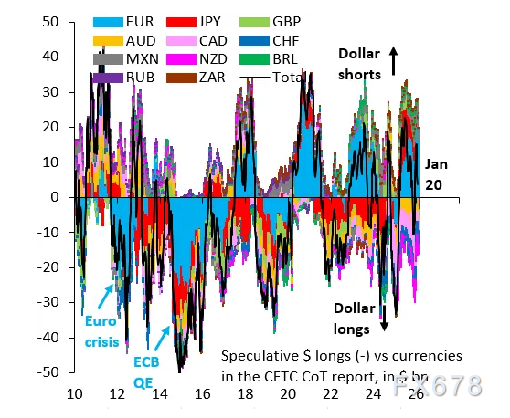 这一点在CFTC每周的持仓报告中显而易见,下图中的黑线显示了美元相对于全球主要货币的总体头寸。截至1月20日,这一头寸基本持平,这意味着外汇市场中的这部分参与者认为美元不会有什么大的波动。市场实际上已放弃看跌美元的预期,因此现在出现持续大幅下跌的可能性很高。